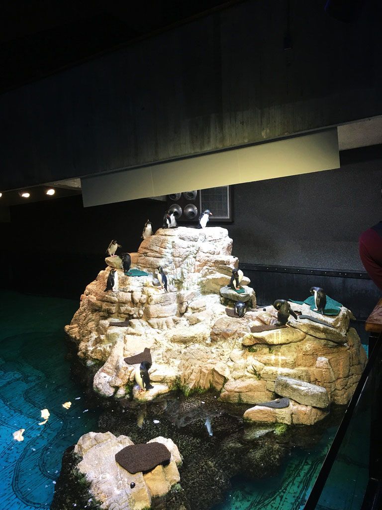 When me and my family entered the building, we were greeted by a massive pool of deep teal water, dotted with many rocky islands.