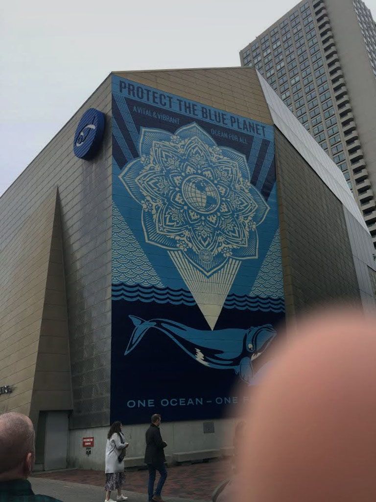 Emblazoned on one of the building’s peculiar facets was a tall mural of an ornate mandala surrounding the planet Earth, and a right whale swimming in the ocean beneath it. Its brilliant blue hues cut right through the pervasive gray haze as easily as a lighthouse beacon.