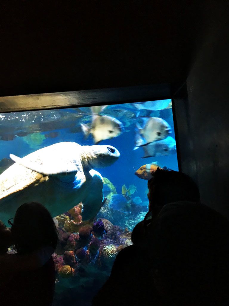 A green sea turtle named Myrtle drifted laps around the ocean tank, swimming in slow, graceful circles.