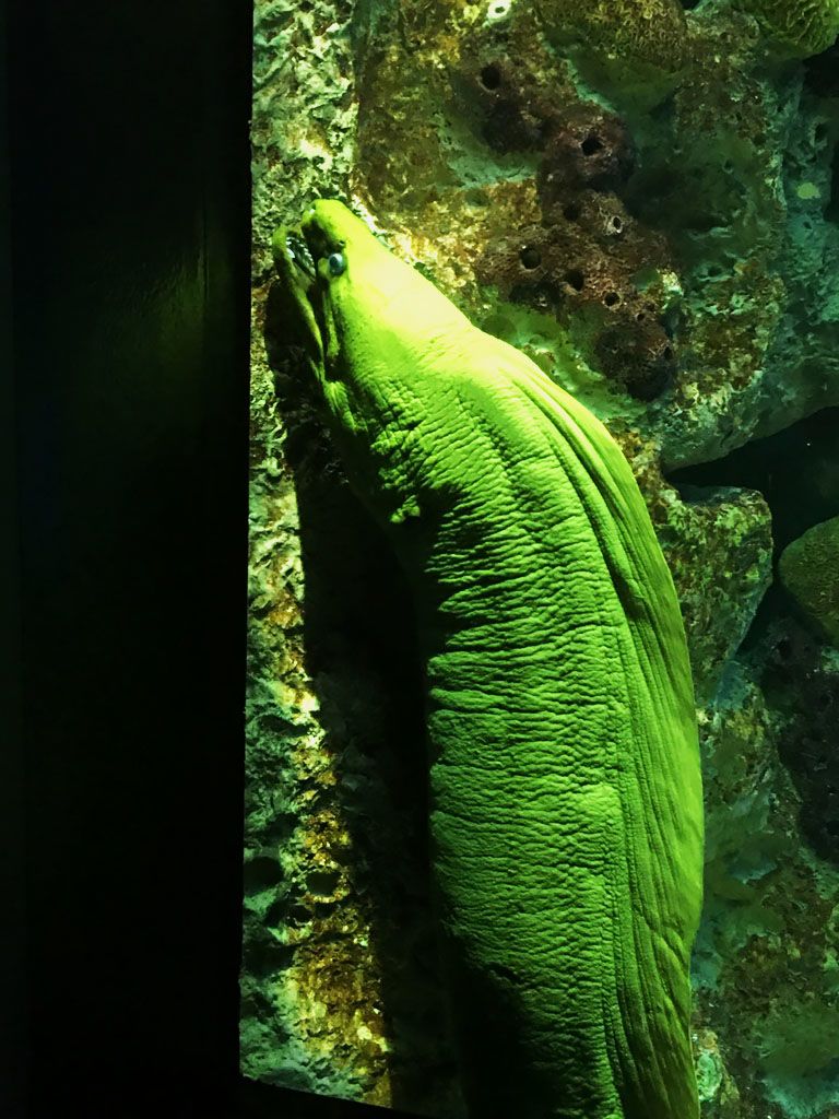 I caught sight of a green moray eel laying against one of the rocky walls of the giant ocean tank. He stood still as a statue, jaws hanging open, flashing his razor-sharp teeth.