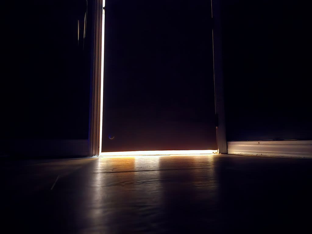 The rim of a cracked bedroom door, with the light from the hallway beyond roaring to break inside, though I often kept it shut out.