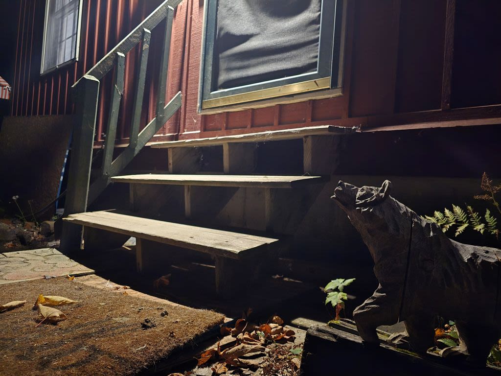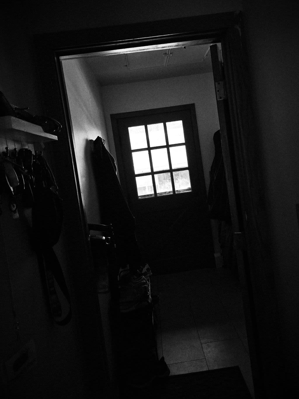 A dark, black and white mudroom of a house. Restricted sunlight streams in through the cell-like glass of the closed front door, barely illuminating the crooked room.