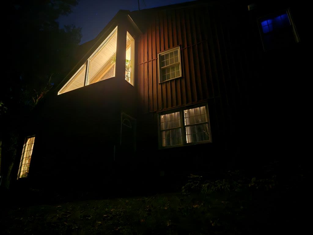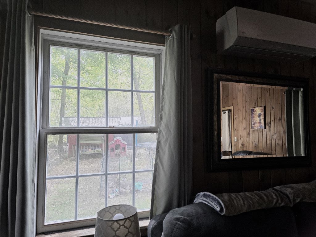 Crooked view of a bedroom window, the same one I stared out of while locked in the house.