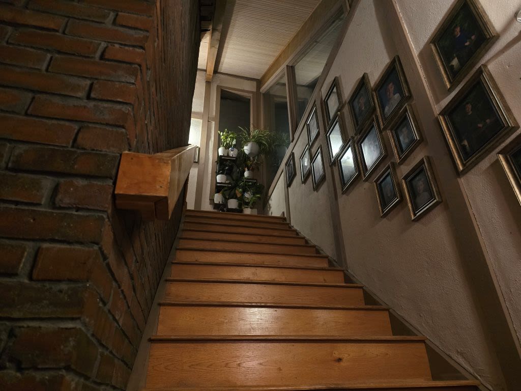 A view up through the stairwell to the second floor. Portraits of my family hang from the wall running up the side of the staircase, blocked by a tower of plantlife my stepmother cared for to stave off the dullness of white and brown walls.