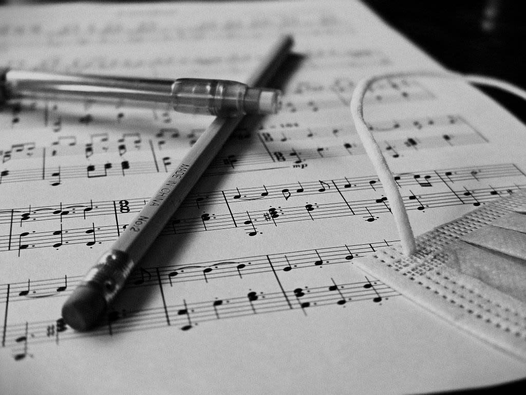 A black and white sheet of piano music. An untouched and unsharpened pencil rests alongside a COVID mask and mechanical pencil, casting shadows of work incomplete.