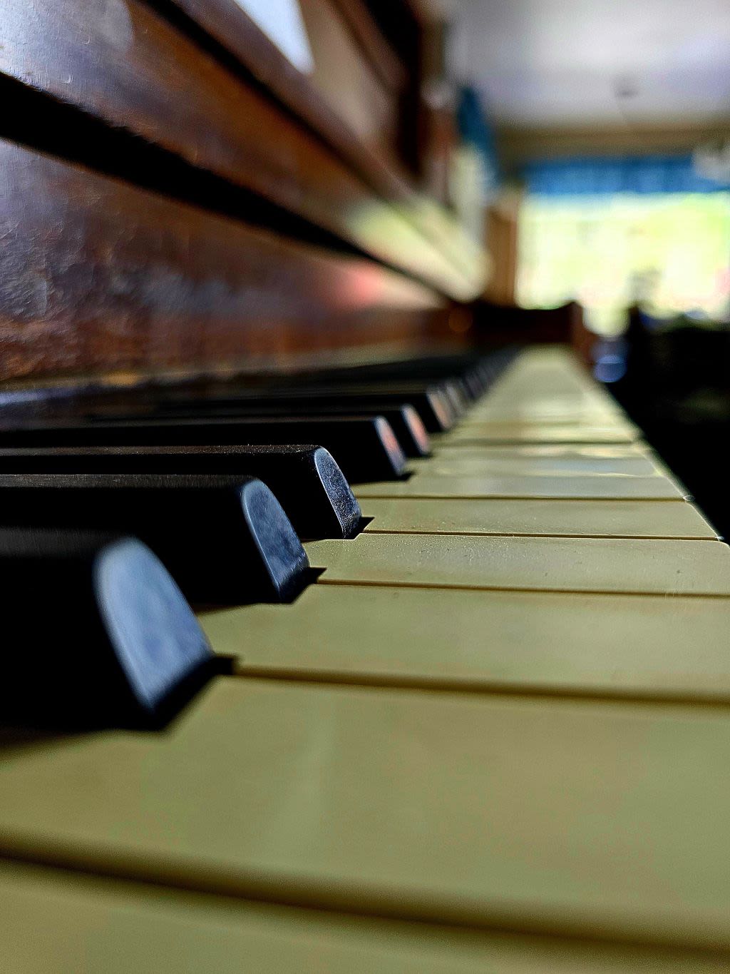 A closeup shot of the ivory keys of an upright piano. Dust tops the keys, at odds with the green color breaking into the room from the window beyond.