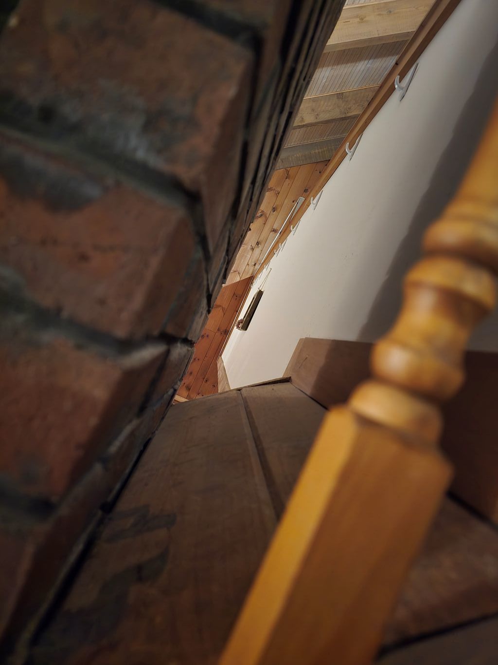 Gazing between pillars, parting the brick from the wooden wall of the catwalk, taken at a crooked angle.