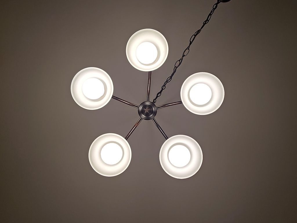 Bottom-up view of the dining room chandelier, muted in shades of black and piercing white that looked over me as I begrudgingly completed my homework.